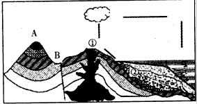 (1)B处地质构造为_______。A处形成该地貌的原因是_________________________________________。 (2)图中所示水循环类型为__________。在其参与下,①处的_______岩可转化为②处的_______岩。 (3)在图中标注箭头表示完整的水循环过程。 (4)简述水循环的意义。 _________________________________________________________________________________________ |