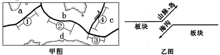 1、甲图中①~④段板块界线中,与其它三段板块界线类型不同的是 |