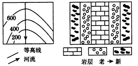 下图中,两幅图是“比例尺相同的同一地区等高线地形图和地质图”。读图判断该地区属于![]() |